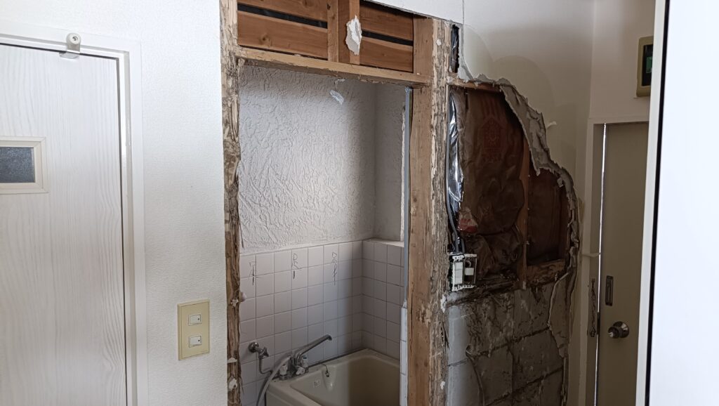 現地確認の結果、浴室周辺の木部にシロアリ被害の可能性があり、早急な対処が必要な状況でした。そのため今回の工事では、既存の在来浴室(タイル張りの浴室)からユニットバスへの変更工事を中心に、建物内部の状況を詳しく確認しながら進めていきます。