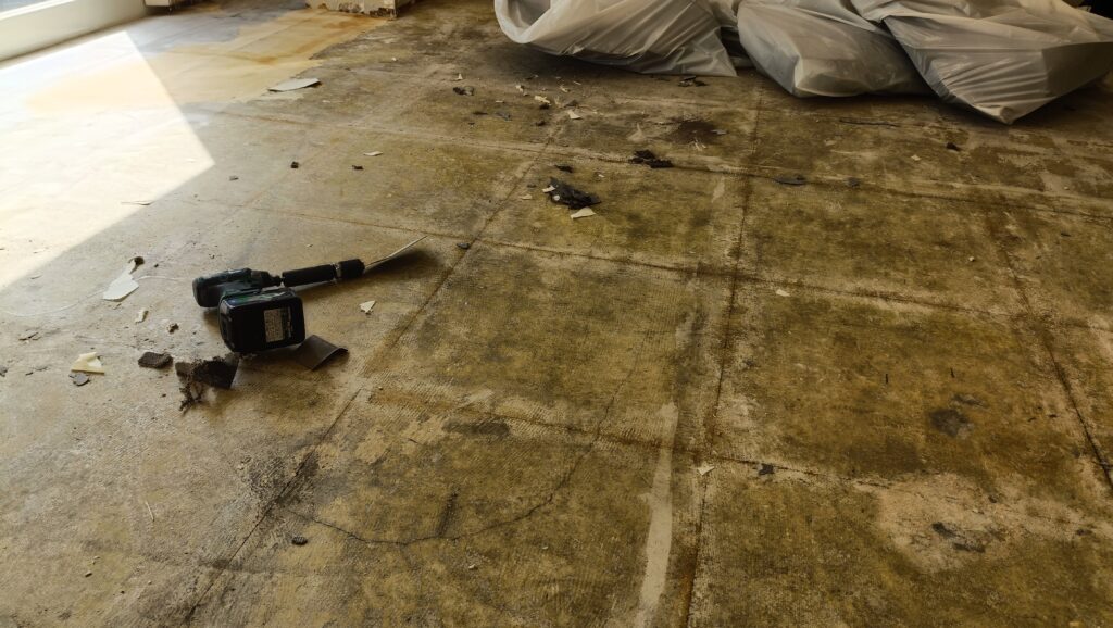 今回の現場では、タイルカーペット自体の撤去よりも下地に残った接着剤の処理にかなり苦戦しました。