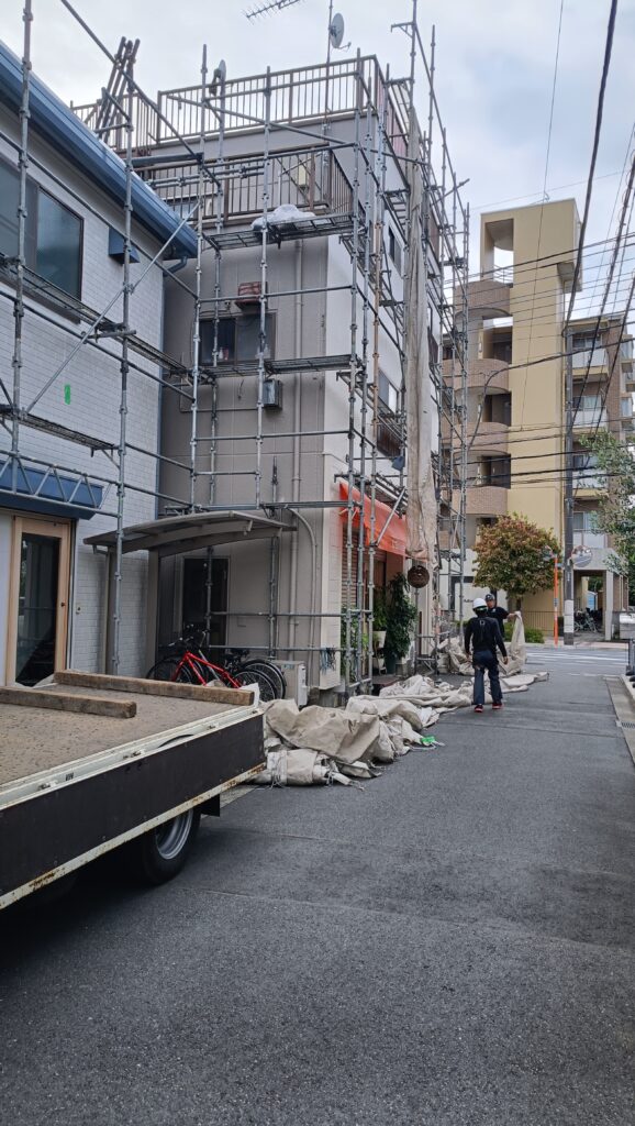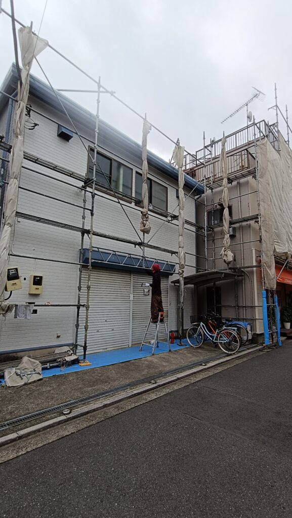 今回の現場は、3階建てのALC外壁の建物と、隣接するサイディング外壁の2階建て建物を同時に施工する内容でした。建物が並んでいるため、工程や足場の計画をしっかり立て、安全面にも十分配慮して作業を進めました。